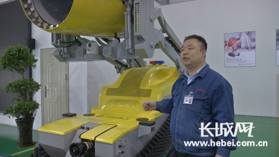 中信重工開誠智能裝備有限公司機(jī)器人研發(fā)部副經(jīng)理孫寧介紹全國(guó)首臺(tái)消防排煙滅火機(jī)器人。楊雨熹攝